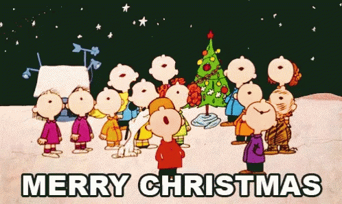 Charlie Brown and the Peanuts gang sing 'Merry Christmas' under a starry, snowy sky with a decorated tree.