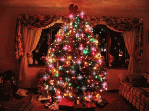 A beautifully decorated Christmas tree glows with lights and ornaments, surrounded by presents on Christmas morning.