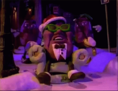 A California Raisin character in a Santa hat and sunglasses celebrates Christmas in the snow with music.
