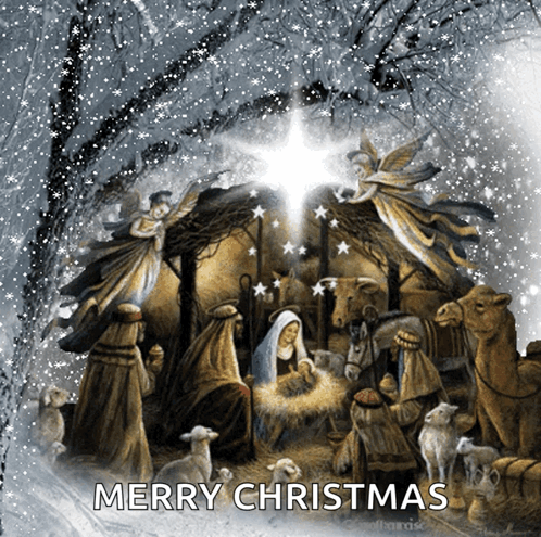 A beautiful Nativity scene depicting the birth of Christ, surrounded by snow, with 'Merry Christmas' text.