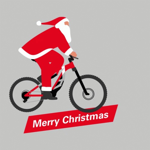 Santa Claus performs a fun wheelie on his bike, wishing everyone a Merry Christmas.