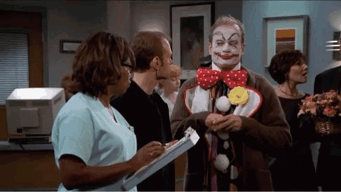 a man in a clown costume is standing next to a nurse holding a clipboard