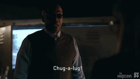 Dean Fogg (Rick Worthy) from The Magicians encourages someone to 'Chug-a-lug!' in a dark room.