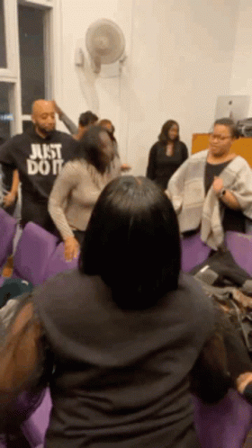 An energetic man in a 'Just Do It' shirt leads a spirited dance during a Pentecostal church worship service.