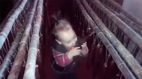A little girl plays with and tastes traditional Georgian Churchkhela candy hanging in a room.