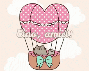 Pusheen and a friend wave from a heart-shaped hot air balloon, saying 'Ciao, amici!' to everyone.