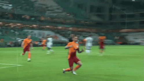 Cicaldau Alexandru celebrates a goal for Galatasaray on the football field, kneeling and looking up.