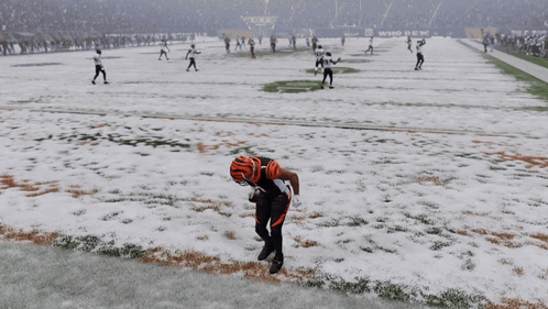 Cincinnati Bengals' Ja'Marr Chase celebrates a touchdown with the Griddy dance in a snowy game.
