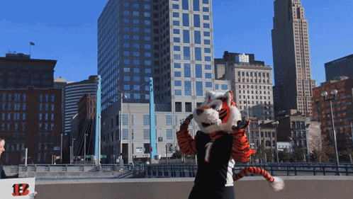 The Cincinnati Bengals mascot, Who Dey, holds a large AAA Super Bowl sign with a woman in a city setting.