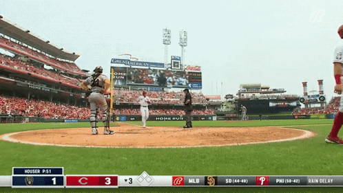 Jake Fraley celebrates a home run for the Cincinnati Reds in a baseball game at Great American Ball Park.