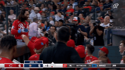 Jonathan India of the Cincinnati Reds celebrates with teammates in the dugout, donning a viking hat.