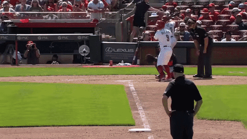 Cincinnati Reds player Matt McLain hits a powerful home run during a baseball game, thrilling the crowd.