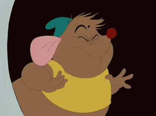 Cinderella's Gus Gus the mouse, happy and excited, wearing a yellow shirt and red nose.