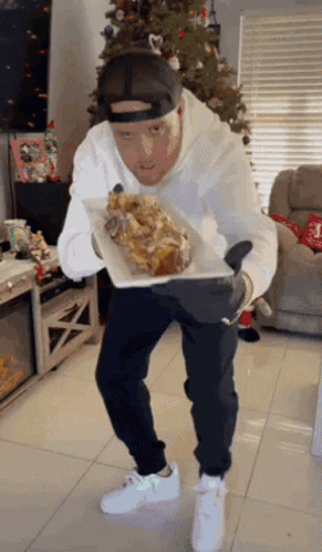 A man in a black cap and white hoodie carries a large platter of delicious, icing-covered cinnamon rolls.