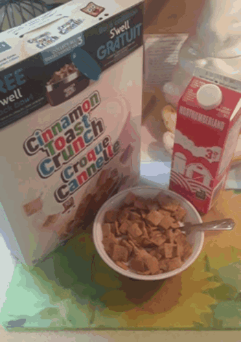 A bowl of Cinnamon Toast Crunch cereal with milk, ready for a delicious breakfast.