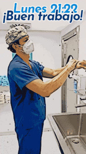 Dr. Guilarte, a plastic surgeon, meticulously washes his hands in blue scrubs and mask, preparing for surgery.