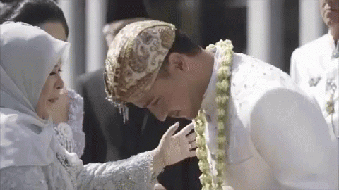 Hamish Daud respectfully kisses an older woman's hand during a traditional Indonesian wedding ceremony.