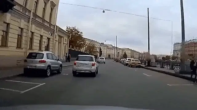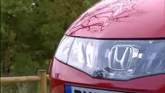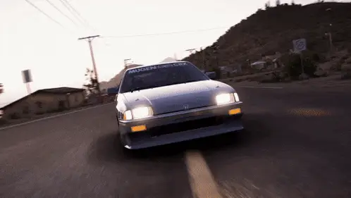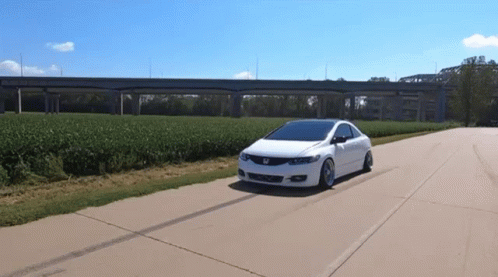 White Honda Civic coupe, bagged with custom wheels, driving on a sunny road next to green fields.