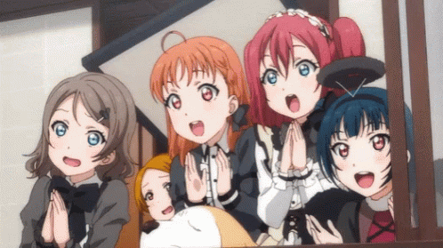 A group of excited Love Live! anime girls clap enthusiastically, looking out a window.