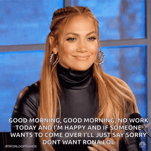 Jennifer Lopez (J Lo) from World of Dance smiles, happy about no work today, wearing a black turtleneck and hoop earrings.