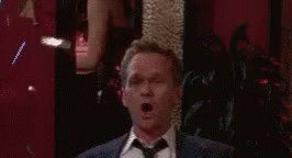 Neil Patrick Harris as Barney Stinson from HIMYM claps enthusiastically amidst falling confetti.