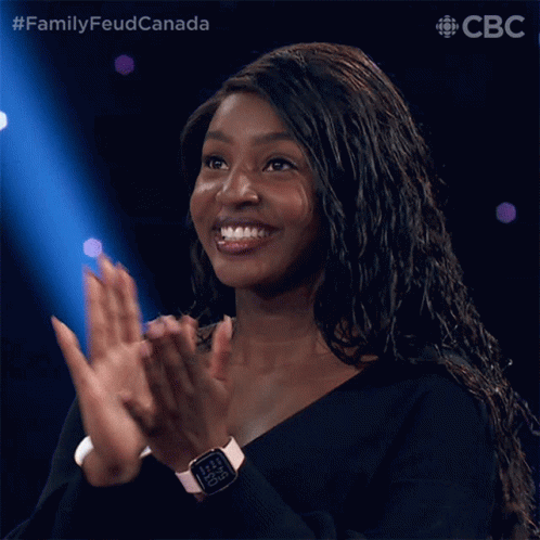 A woman enthusiastically claps during an episode of Family Feud Canada, wearing a watch that displays 3:00.