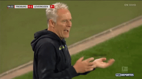 Christian Streich, coach of Freiburg, claps during a Bundesliga match against Leverkusen.
