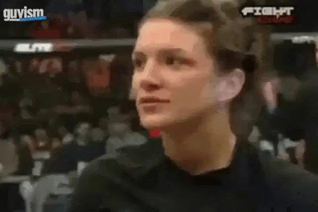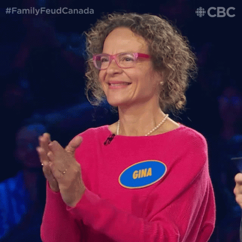 Gina from Family Feud Canada claps happily, wearing a pink sweater and glasses.