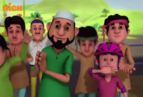 Motu Patlu characters clap and cheer enthusiastically, possibly during a scooter race, with a child covering their mouth.