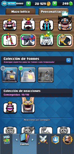 A detailed view of the Clash Royale mobile game's customization and collection menu, showing tower skins and reactions.