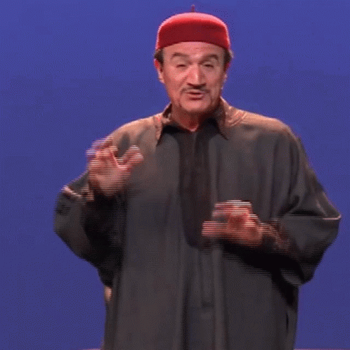Fellag, wearing a red hat and grey coat, waves to the audience in a scene from Classe Kabyle.