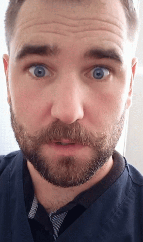 A man with a classy mustache and beard, possibly David, makes a funny, surprised face.
