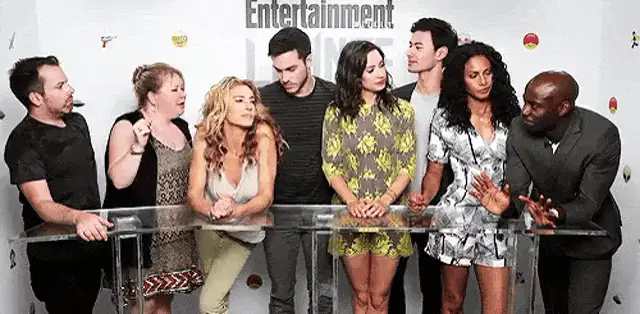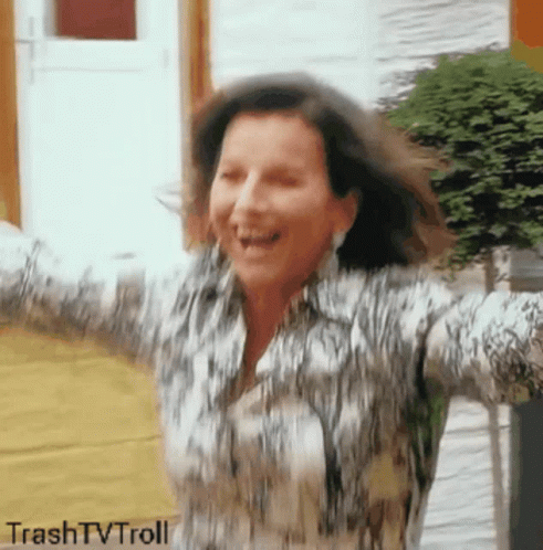 Claudia Obert smiles brightly, arms outstretched, in a patterned shirt. A moment of pure joy.
