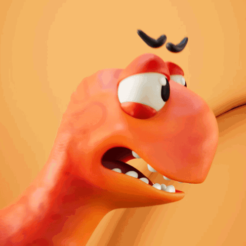 An orange and a blue Claynosaurz dinosaur show agitated, angry expressions, baring their teeth.
