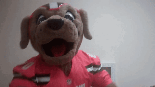 Cleveland Browns mascot Chomps shows off some energetic moves and flexing, wearing a pink jersey with '00'.