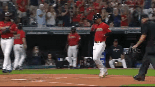 Andres Gimenez of the Cleveland Guardians celebrates a home run, high-fiving a teammate on the field.