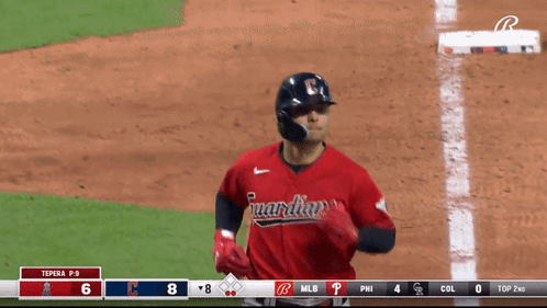 Andres Gimenez of the Cleveland Guardians celebrates on the baseball field after a play.