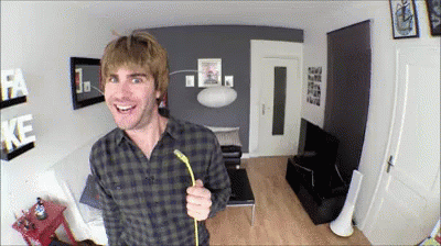 Man in plaid shirt with a playful expression, holding a yellow cable in a living room with a 'FAKE' sign.