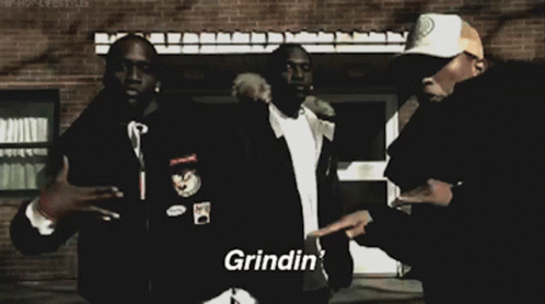 Clipse performs their song "Grindin'", with three men in front of a brick building, one actively rapping.