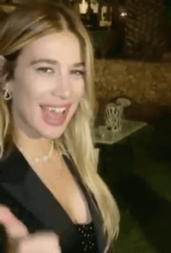 Clizia Incorvaia smiling and making a rock and roll hand gesture, showing her playful side.