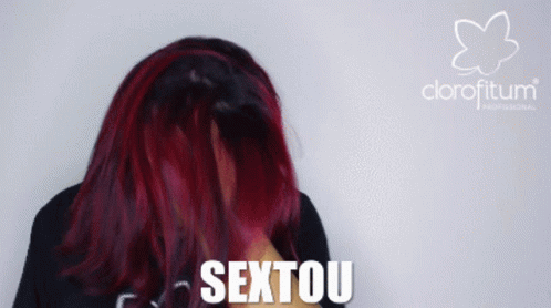 A woman with vibrant red hair playfully covers her face, celebrating 'Sextou' with Clorofitum.