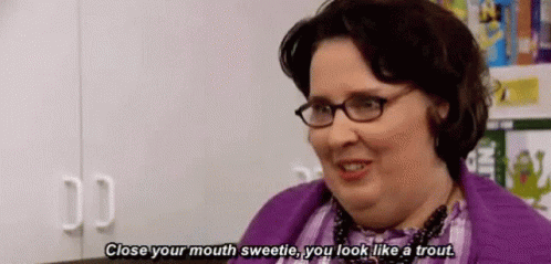 A woman in glasses delivers a sharp line: 'Close your mouth sweetie, you look like a trout.'