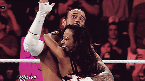 CM Punk and AJ Lee share a joyful embrace in the WWE wrestling ring, celebrating a moment together.