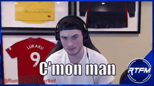 Man with headphones and cap makes an exasperated expression with 'C'mon man' text overlay.