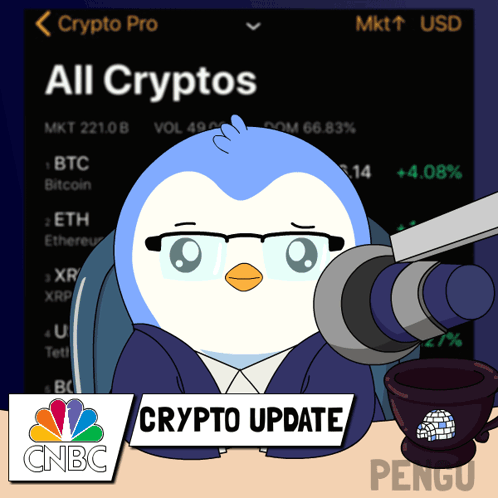 a cartoon of a penguin sitting in front of a microphone with the words crypto update on it