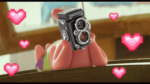 Patrick Star from Spongebob Squarepants depicted with a vintage Rolleiflex camera head, surrounded by hearts.