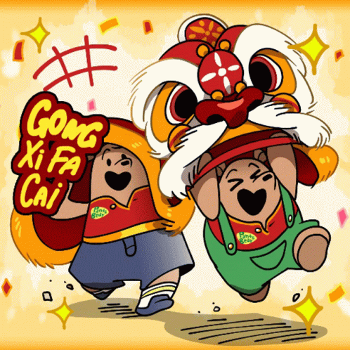 Cartoon drawing of two boys holding a sign that says 'Gong Xi Fa Cai' for Chinese New Year.
