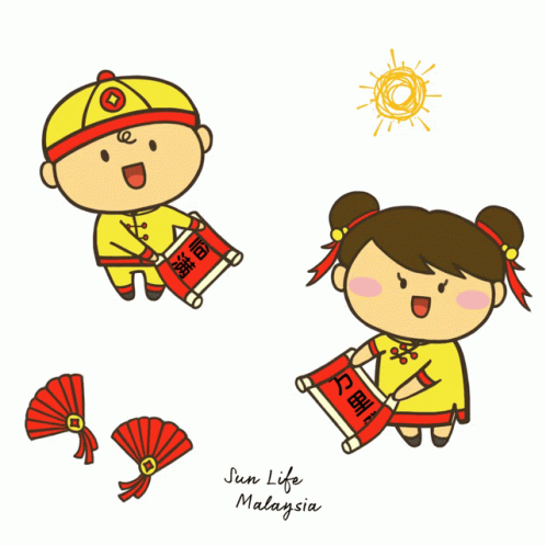 Cute cartoon boy and girl in traditional attire holding Chinese New Year scrolls with festive greetings.
