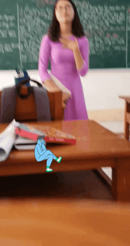A beautiful Vietnamese teacher, Co Van Xanh La Xinh Dep, stands gracefully in a classroom.