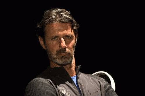 A male tennis coach with a beard, wearing a dark jacket, shows a range of expressions from serious to a smile.